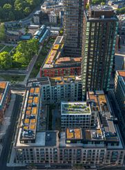 Byggeriet rummer i alt 288 boliger samt kontorer og erhvervslejemål fordelt på 45.800 m2.