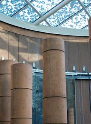 Huset indeholder to elipseformede bygninger og er tegnet af den berømte britiske arkitekt Norman Foster.
